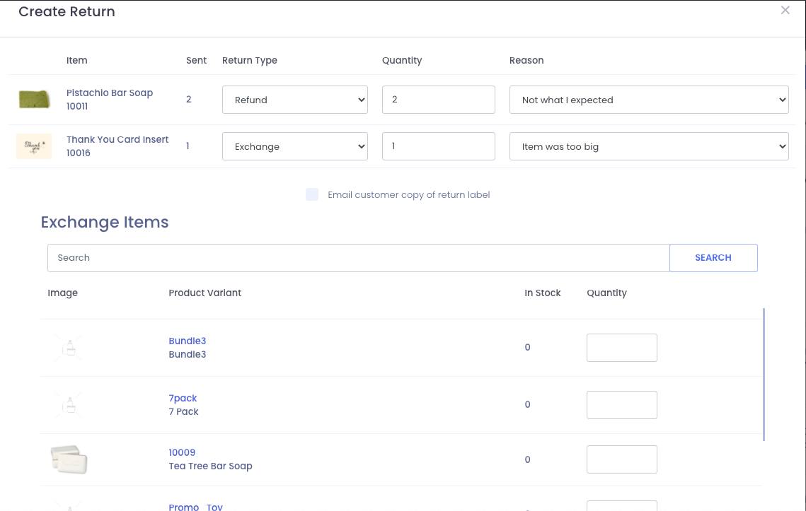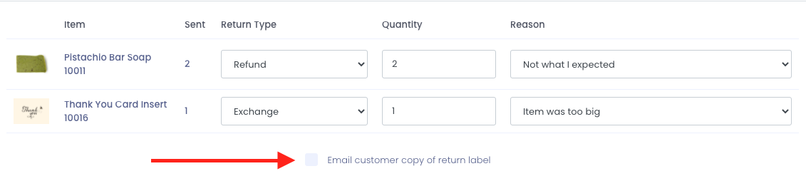 - Be sure to check ’email customer a copy of return label’ if you are planning on having the customer send back the original order.