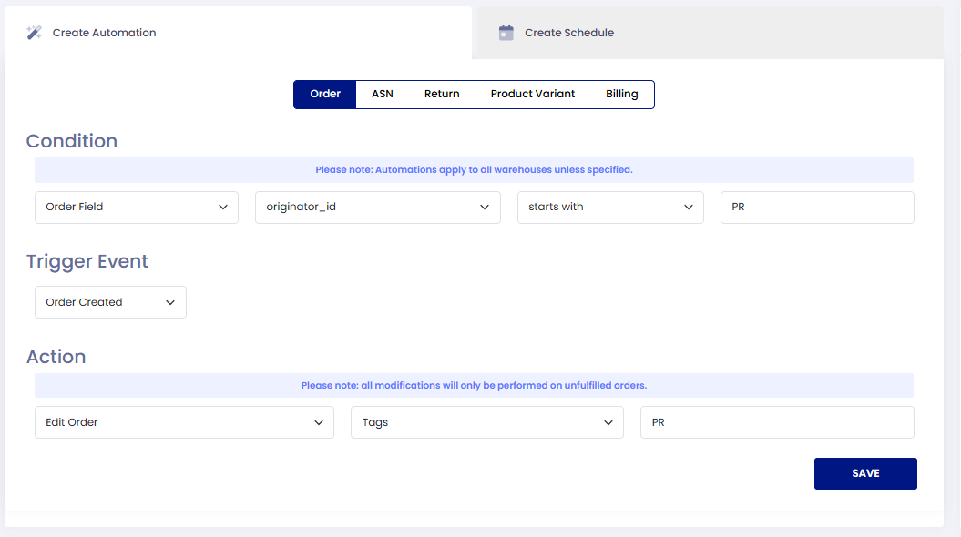 Letβs say you frequently enter manual orders for press samples, and you prefix those orders with "PR" to track them internally. With this automation in place, every time an order is created with an order number like PR123456 , the system will instantly add the tag PR , keeping your orders organized without any manual steps.