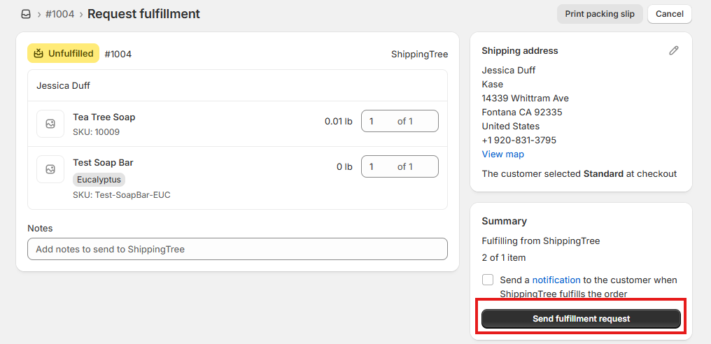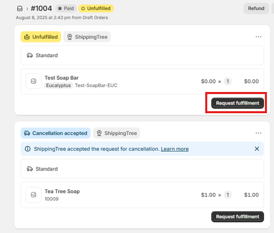 β οΈ If you do not click Request Fulfillment, your order will remain unfulfilled in Shopify and will not be shipped as we will not have visibility of the order.