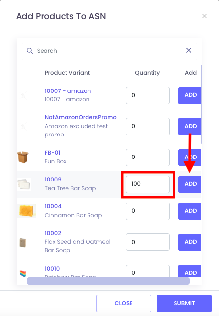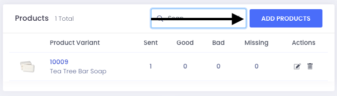 - Add the items you are sending, entering the quantity for each product, and click 'Add'.