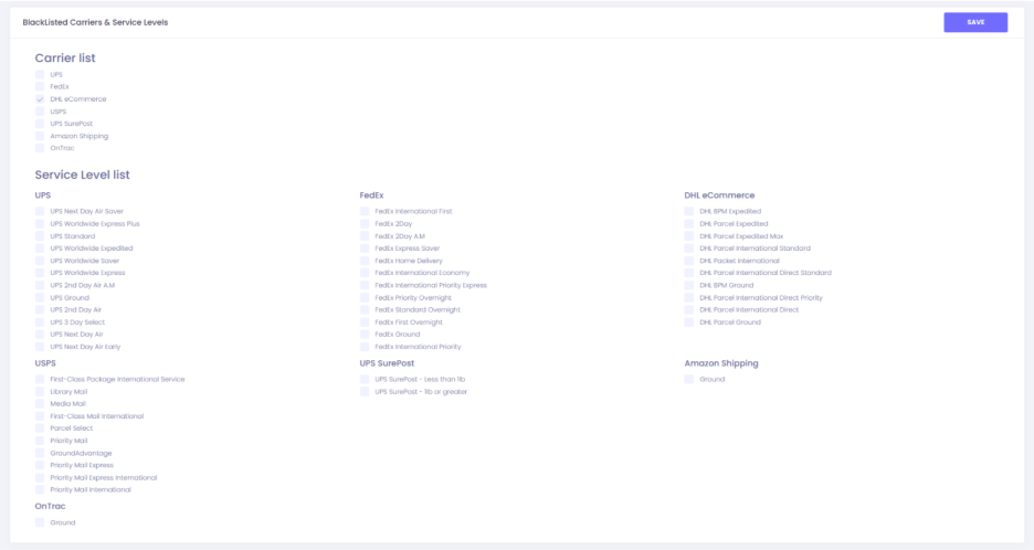 - Checking a box here will blacklist only the specific service selected (e.g., USPS First Class, UPS, Ground).