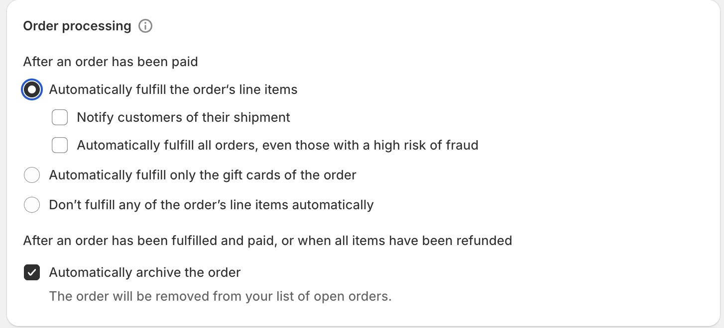 Under After an order has been paid, select the option Automatically fulfill the order's line items.