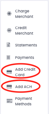 In the box near the left rail, select ‘Add Credit Card’ or ‘Add ACH’