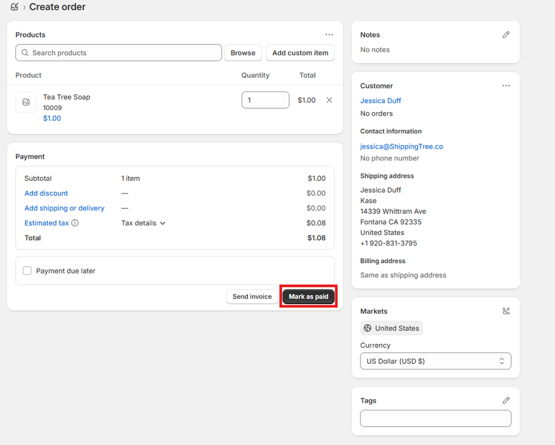 Click “Mark as Paid” to finalize the test order.