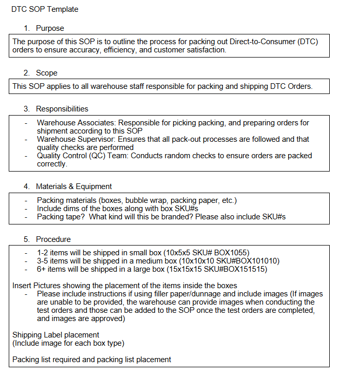 When utilizing branded packaging for Direct-to-Consumer (DTC) orders or kitting, it is crucial to provide a clear Pack Out Standard Operating Procedure (SOP). This SOP ensures that our warehouse team follows the correct steps to maintain brand consistency and order accuracy. if you are not using branded packaging, we will use our standard packaging available in the warehouse.