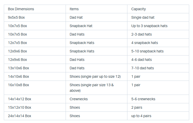 - The Breakdown provided below is of example pack outs, our team will always use the smallest box/mailer possible and kraft paper for additional cushioning to protect product while in transit, if product does not fit in the box, we will move up one box size.
