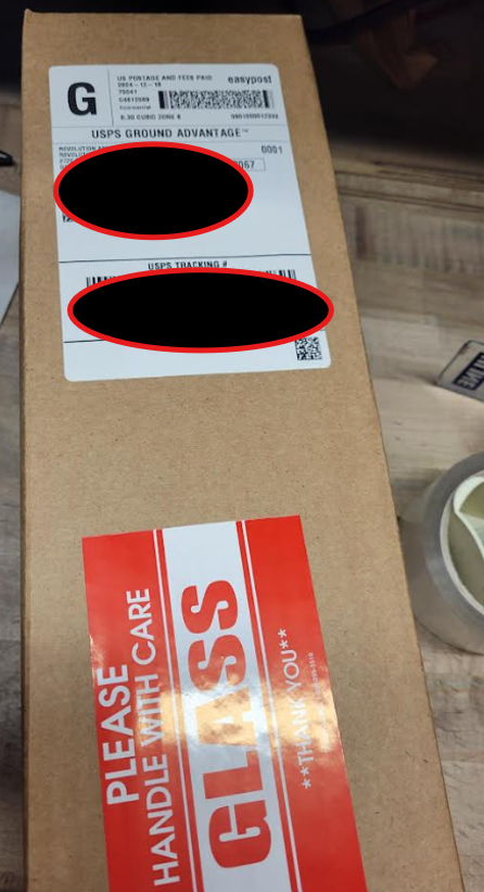 - Place "Handle with Care" sticker on the outside of the box on the same side as the shipping label
