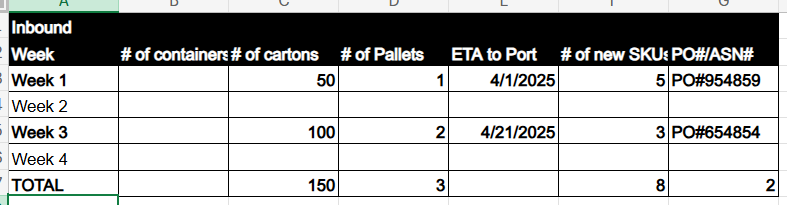- Number of Pallets: Total pallets arriving each week (leave blank if not expecting pallets).