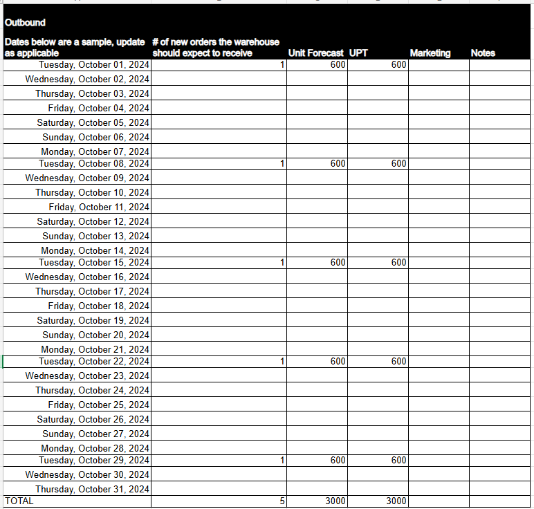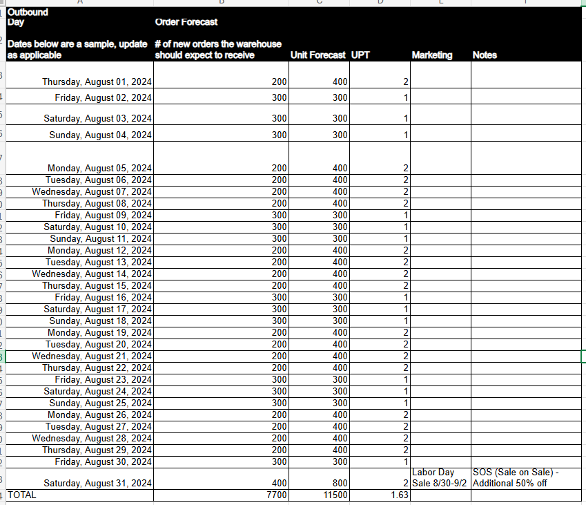 To ensure efficient warehouse operations and accurate labor planning, we require all clients to submit their monthly forecast by no later than the 15th of each month for the following month. For example, April's forecast must be submitted by EOD March 15th. A forecast template is provided for your convenience during onboarding, which includes the following tabs: