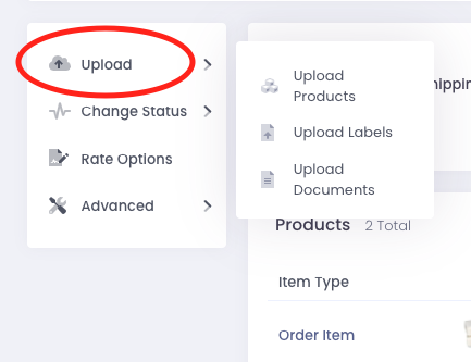 Inside the order page, near the left hand rail, select ‘upload’. The dropdown offers three options: ‘Upload Products’, ‘Upload Labels’ and ‘Upload Documents’. Upload the appropriate documents to the order and they will be included with your shipment.