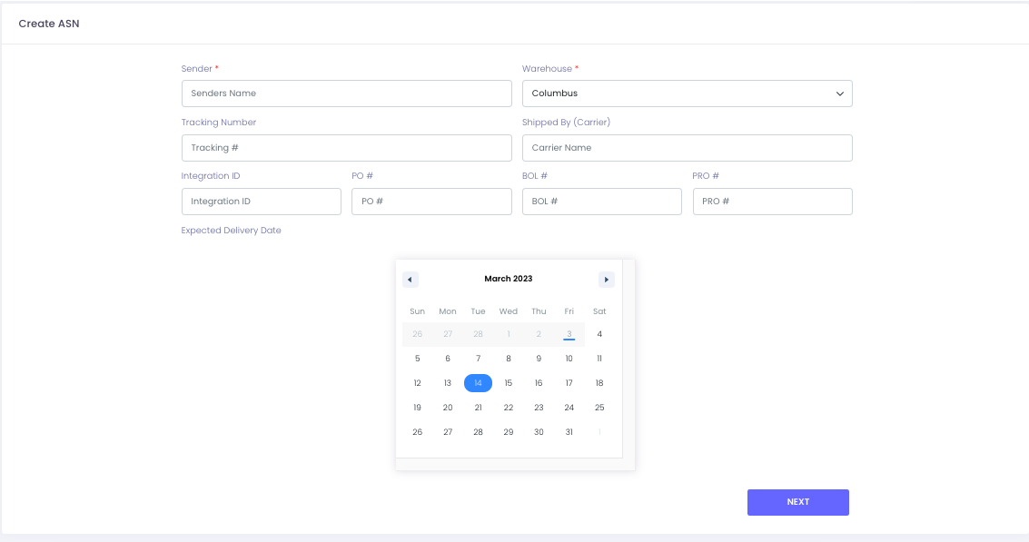 Fill out the ASN form and select the estimated delivery date. Sender and warehouse are required fields. The remaining fields are optional and can be updated after the ASN has been created if needed. Click 'Next' to move on to the next screen.
