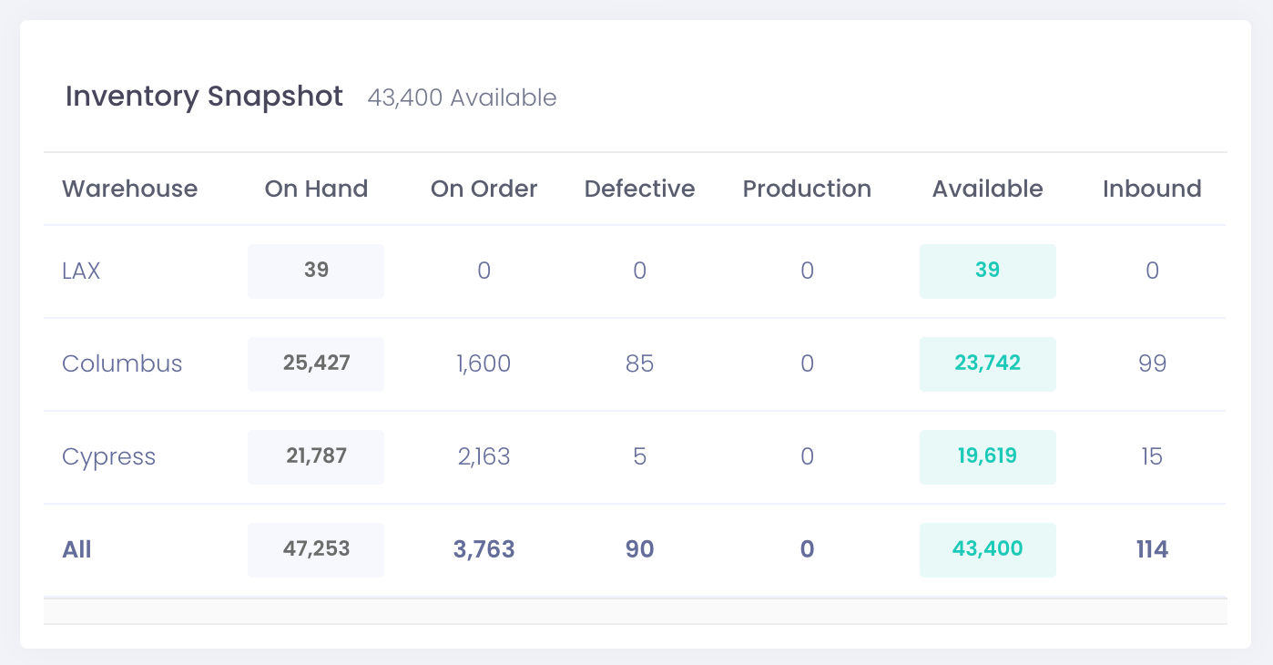 On Hand: Inventory currently on hand in the warehouse