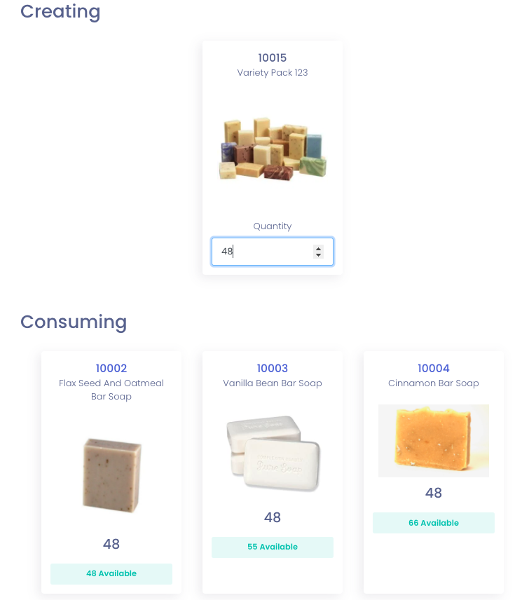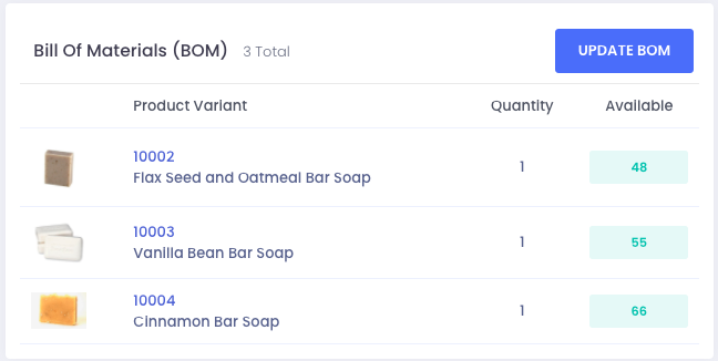 Select the items and quantities needed to build the completed kit, and select ‘update’. In this case, we will add quantity one of three different soaps. This will create a finalized Bill of Materials (BOM) on the product page (you can update the BOM using the ‘Update BOM’ bottom in this box as well