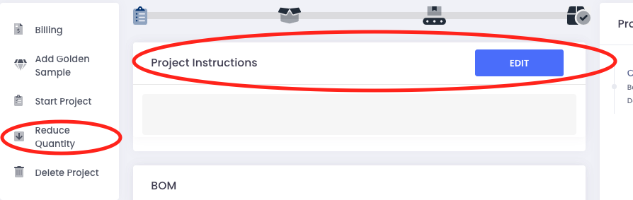 Inside the Project, most of the tabs, information and workflows are for internal purposes. There are two useful tools for you, the merchant: Reduce Quantity and Project Instructions. If you need to reduce the amount of kits being made or add notes to the project (i.e. please make sure item A is placed facing down), you can use the two buttons marked below in red