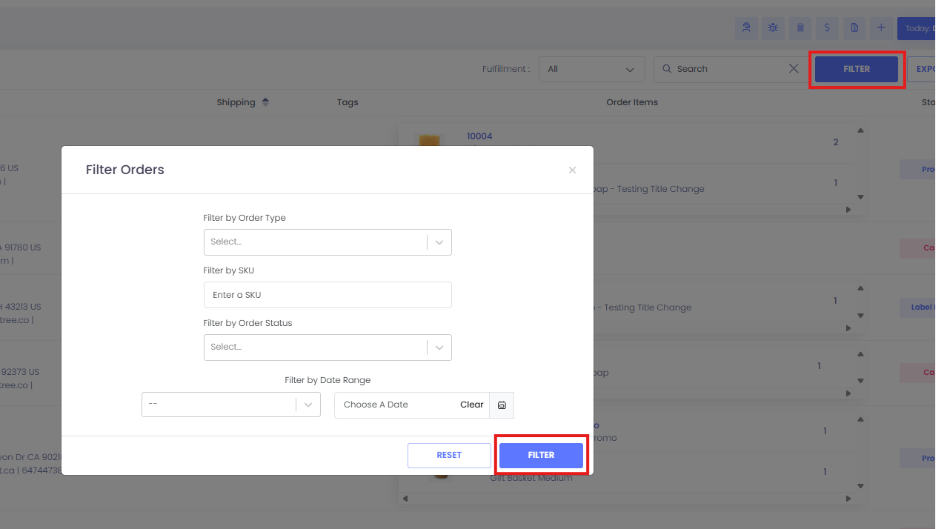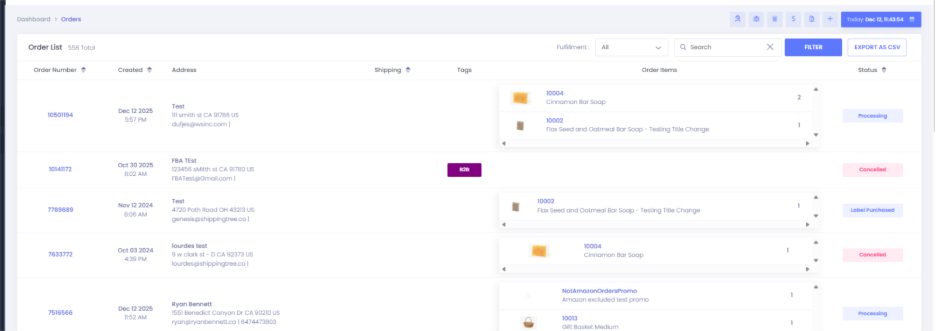 This page displays all orders available to your account and is where filters and exports are applied.