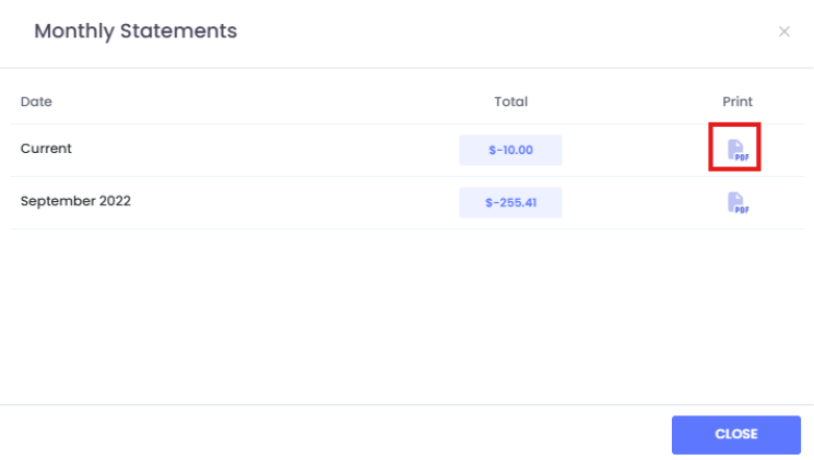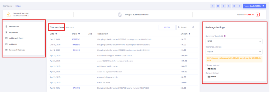 The Billing page in the Kase app provides full visibility into your account balance, transactions, statements, and payment methods. From this page, you can review live charges, download monthly statements, manage payment methods, and configure recharge settings.