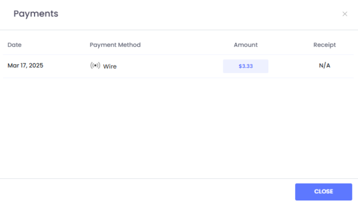 - Payment method (Credit Card, ACH, Wire, etc.)